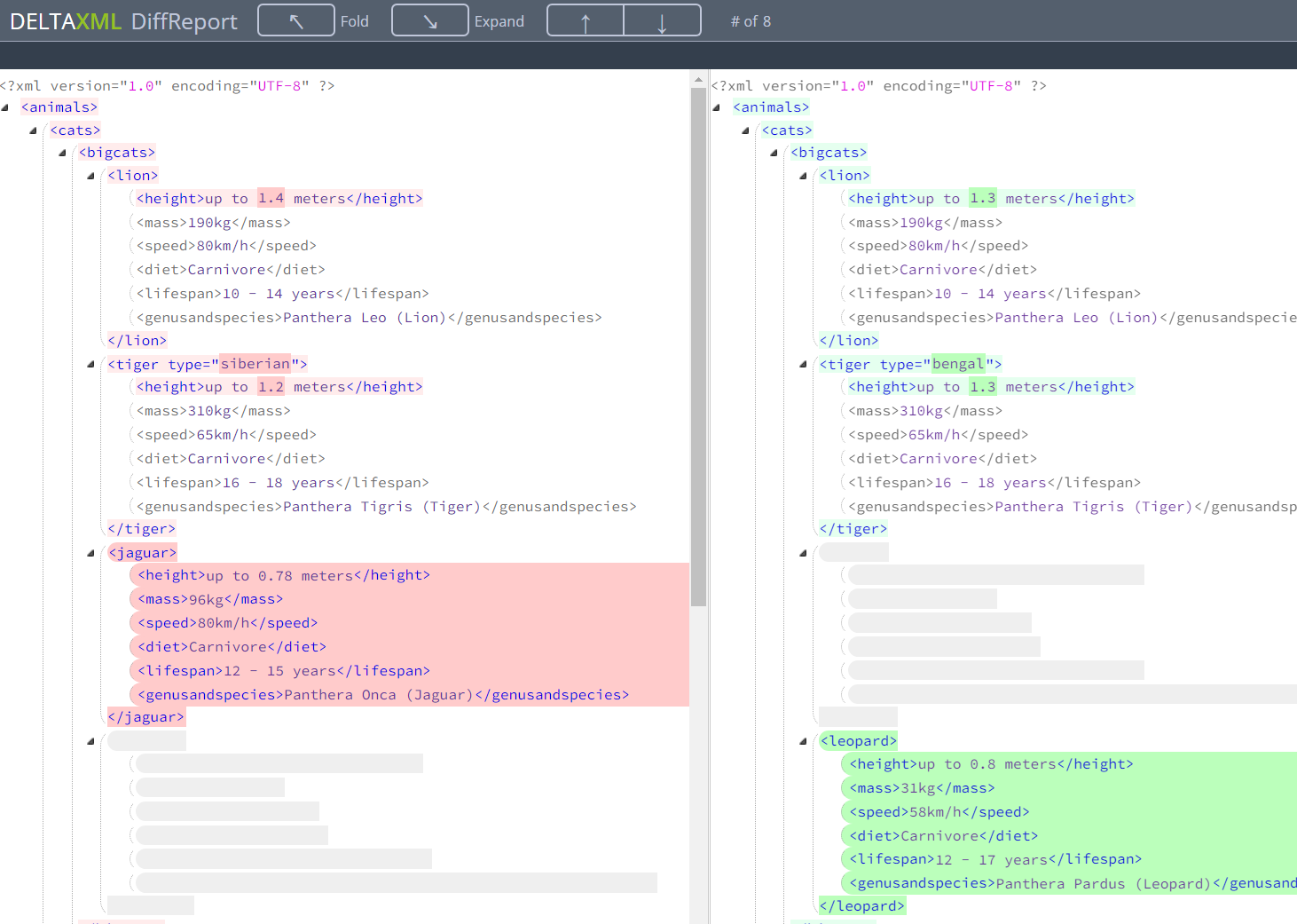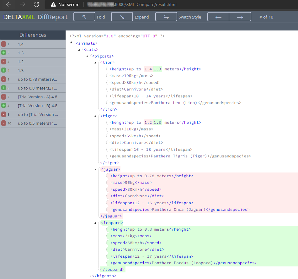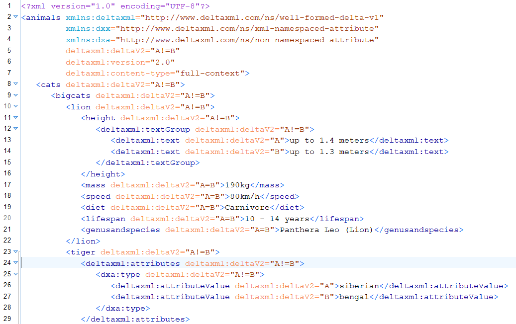 The Do-Compare-Java result produces a file which can be opened in any IDE, text editor or suitable XML viewer and will look something like this with change marked up in the xml.