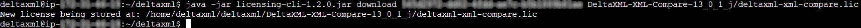 java -jar licensing-cli-1.2.0.jar download a99bb999-ccc9-99dd-9999-9e9ff99ggg9h /home/deltaxml/deltaxml/DeltaXML-XML-Compare-13_0_1_j/deltaxml-xml-compare.lic
