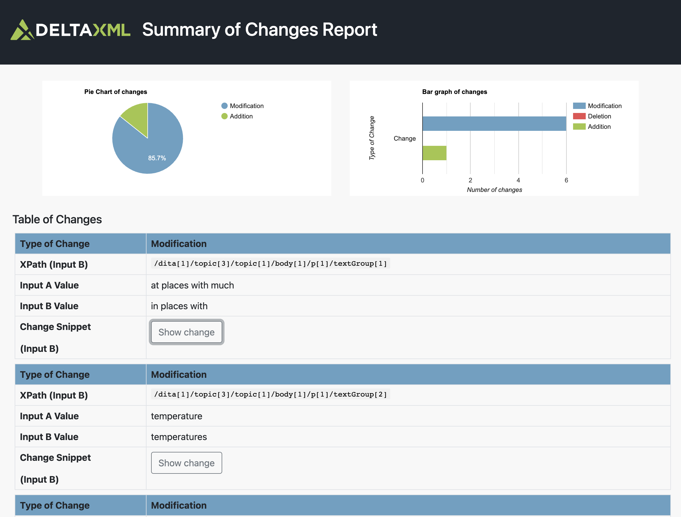 At the top left is shown a pie chart that gives a summary of the percentage of the three types of changes which are deletion, addition, and modification. This will only list the types of change that exist for the inputs.