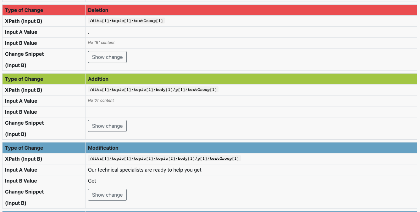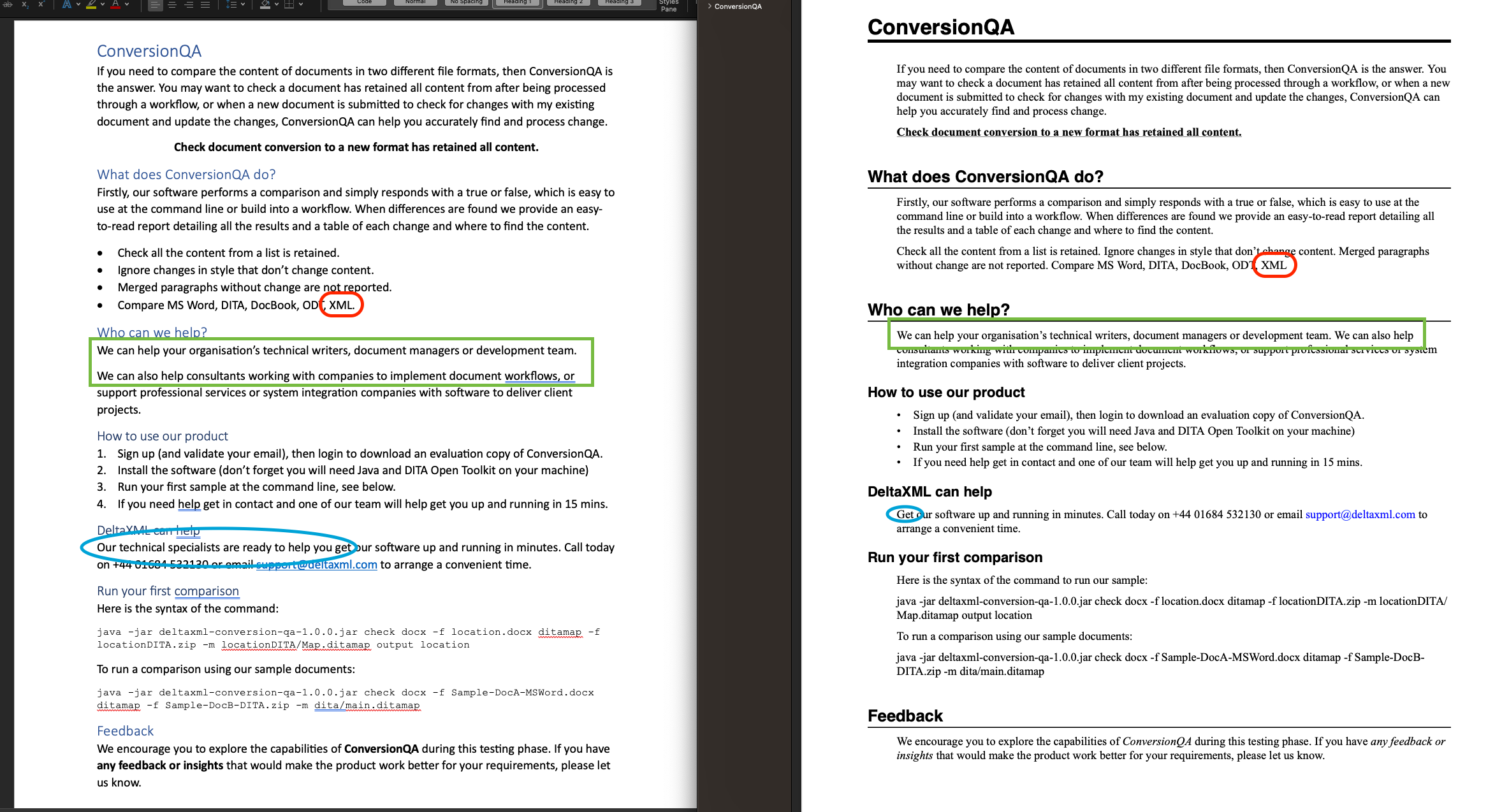 Please note an “Addition” has been marked in the summary of changes report. This is due to the fact that the transformation from Word to DITA map combines the 2 paragraphs (highlighted in green) on the left in the word document to a single paragraph in the DITA map on the right- with the second line starting after a space character. Hence, addition of a space character is reported as shown above in the screenshot of the report.