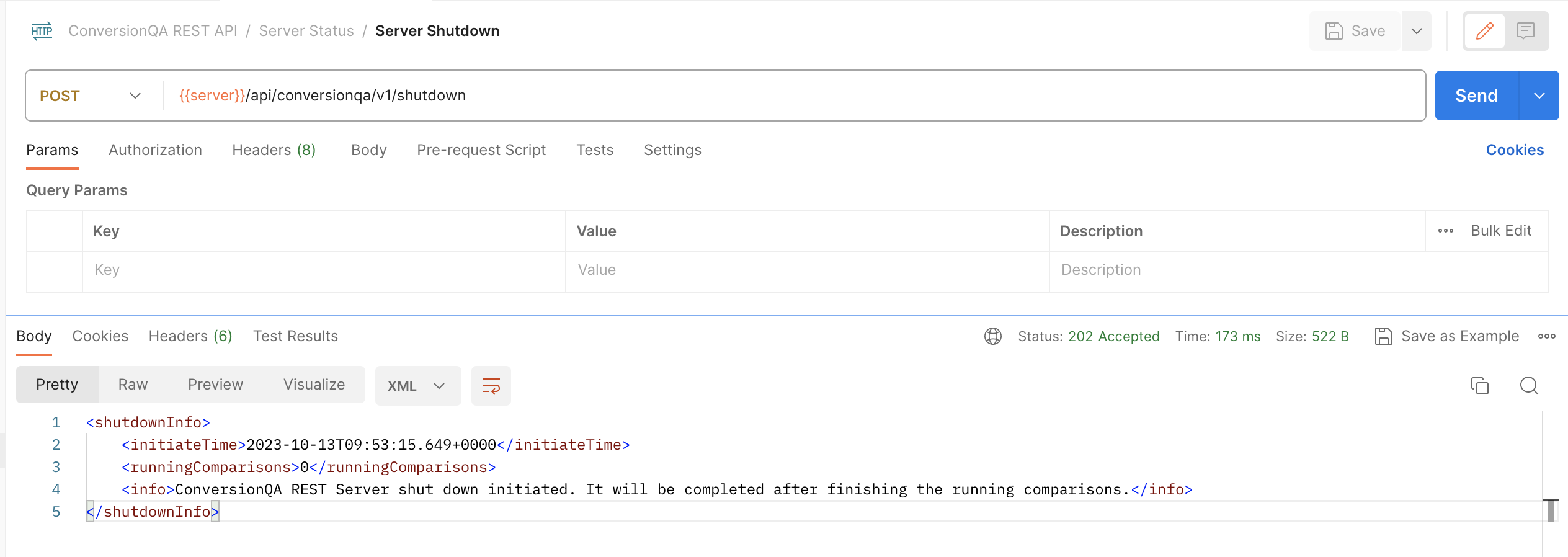 In the above cases, the REST server will check for any running check operations before initiating the shutdown. ConversionQA REST will shut itself down after completing all the running operations. At the same time, the server will not accept any new check operation request.