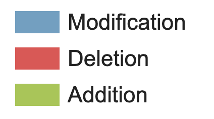 There are three main parts to the summary of changes report. All parts use a common colour code for the three types of change detected; blue for modification, red for deletion, green for addition.