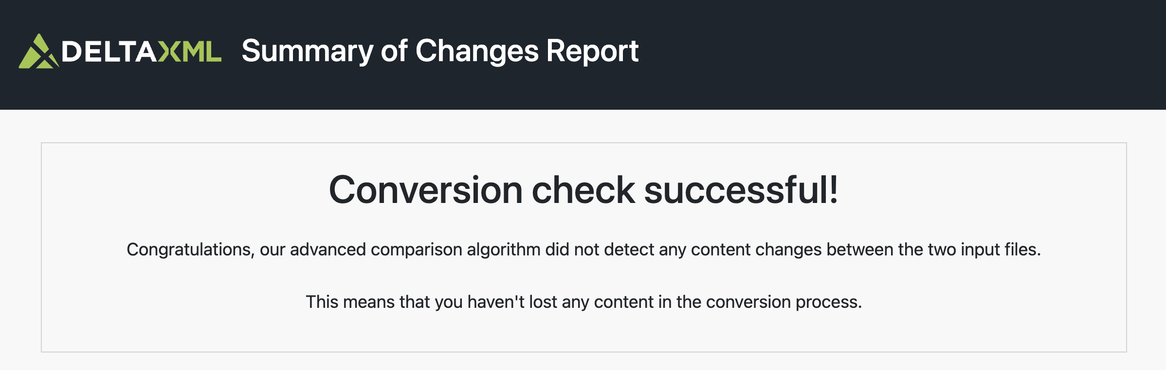 If the conversion did not lose any content then ConversionQA will report a successful conversion and the summary report will look like this: