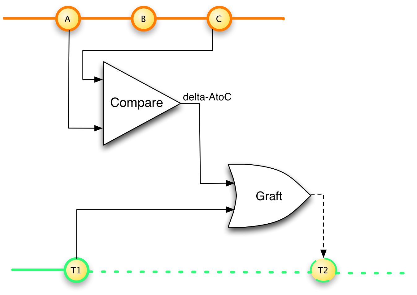 The following diagram depicts a typical graft scenario. There are three successive versions of some data called A, B and C. The compare operation can be applied to two adjacent versions in the sequence, such as A and B, or it could cover a range of versions of the data. In this case versions A and C are compared. There is also a target T1 which will be used as input to the graft and the graft process will create the next, updated version of that file T2 which could be saved as the next version on that branch.