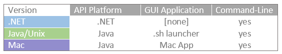 DITA Compare can be downloaded in three different versions. The Mac and Java/Unix versions provide a Java API whereas the .NET version provides a .NET API, and also differs from the others as it comes without a GUI application (which requires Java). The Mac and Java/Unix versions represent builds optimised specifically for the Mac and Unix operating systems, hence the minor differences between them are associated with the way the application is installed and the GUI application is started. The versions are summarised below: