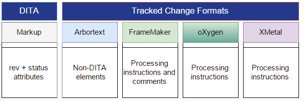 The result of a comparison is a DITA document that shows differences either using standard DITA markup or markup/processing-instructions tailored for specific DITA tools. The available output formats are standard DITA (exploiting rev and status attributes), plus tracked change formats for the Arbortext, FrameMaker, Oxygen and XMetal editors. These are summarised in the table below, and described fully in the Output Formats section of the Reference document.