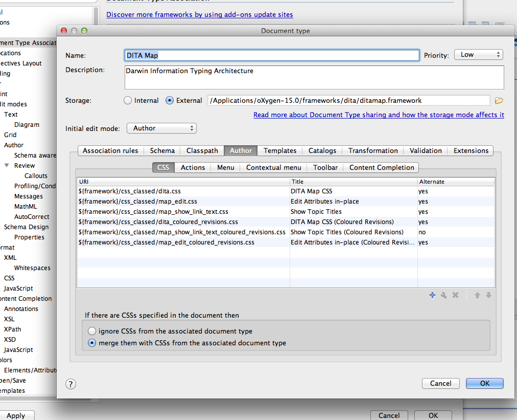frameworks/dita/css_classedinside your oxygen install directory, but this may vary if using custom frameworks or project-specific frameworks) and copy the four files fromsamples/resources/cssinto this directory, Click '+' to add a new CSS file and add URLs to the files copied in the previous step with these suggested titles: