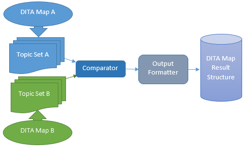 This comparison type involves the comparison of a set of all the topics referenced from the supplied top-level DITA maps. Here's a high-level diagram showing the comparison: