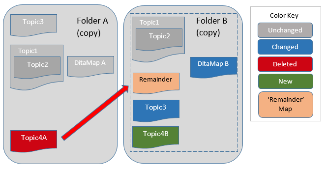 This diagram shows the DITA map labelled DitaMap B only references topics in Folder B, but there's now an additional Remainder DITA map. This Remainder DITA map references all topics referenced in the DitaMap A map, but not found in DitaMap B, effectively the deleted topics.