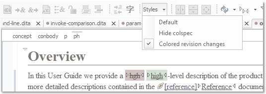 This DITA Markup output is 'vendor neutral' such that it can be rendered in a useful way in any XML editor that either works with conditional processing or attribute-controlled styling of the WYSIWYG (author) view. The screenshot below shows the output as viewed in the 'author' view of Oxygen XML Editor - with the 'Colored revision changes' style selected: