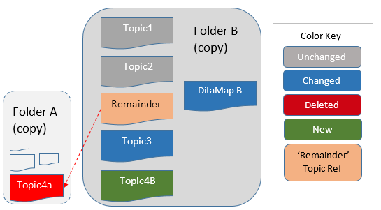 This diagram shows the DITA map labelled DitaMap B references topics in Folder A and Folder B. The topicref elements in DitaMap A referencing topics not referenced in DitaMap B are adjusted and inserted into DitaMap B, but marked as deletions.
