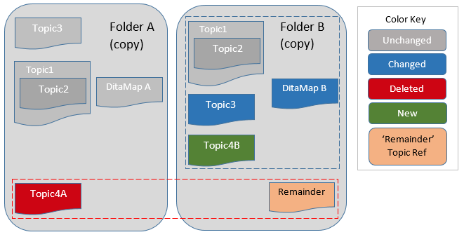 This diagram shows the DITA map labelled DitaMap B only references topics in Folder B, but there's now an additional Remainder DITA map. This Remainder DITA map references all topics referenced in the DitaMap A map, but not found in DitaMap B, effectively the deleted topics.