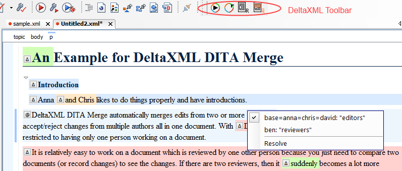 Once the add-on is installed, the DeltaXML toolbar will be displayed as shown in the screen shot below. This toolbar is used to convert the DITA Merge result and then display and manage changes in Oxygen.