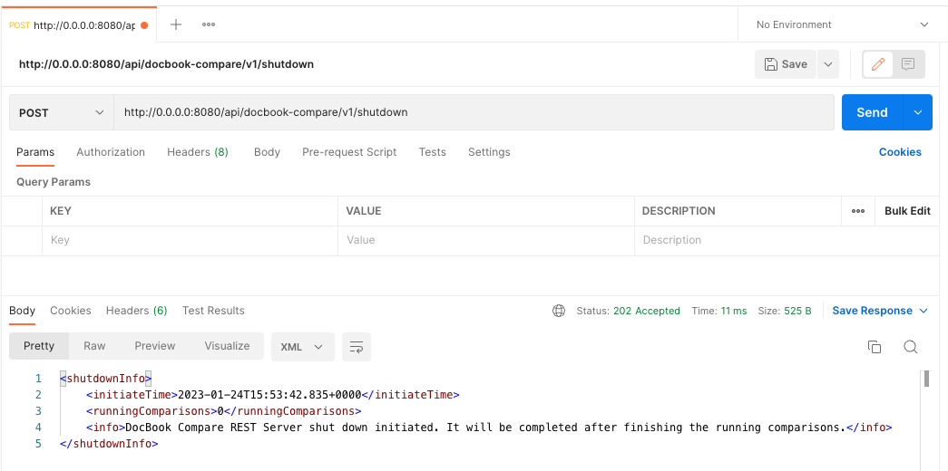 In all above cases, the REST server will check for any running comparisons before initiating the shutdown. REST Server will shut itself down after completing all the running comparisons. At same time, the REST server will not accept any new comparison.