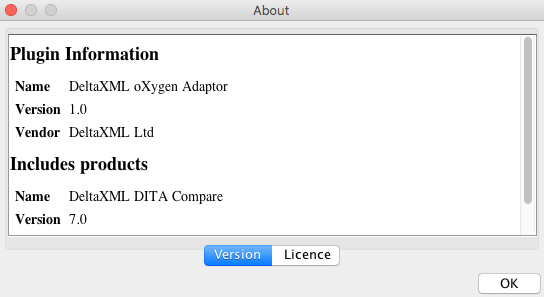 Selecting 'DeltaXML → About' shows information about the version of the Adaptor and the comparison products that are currently associated with it. For example: