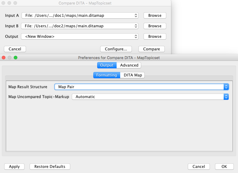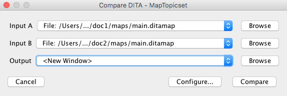 Selecting DeltaXML → Compare DITA - MapTopicset..., which will bring up a comparison box: