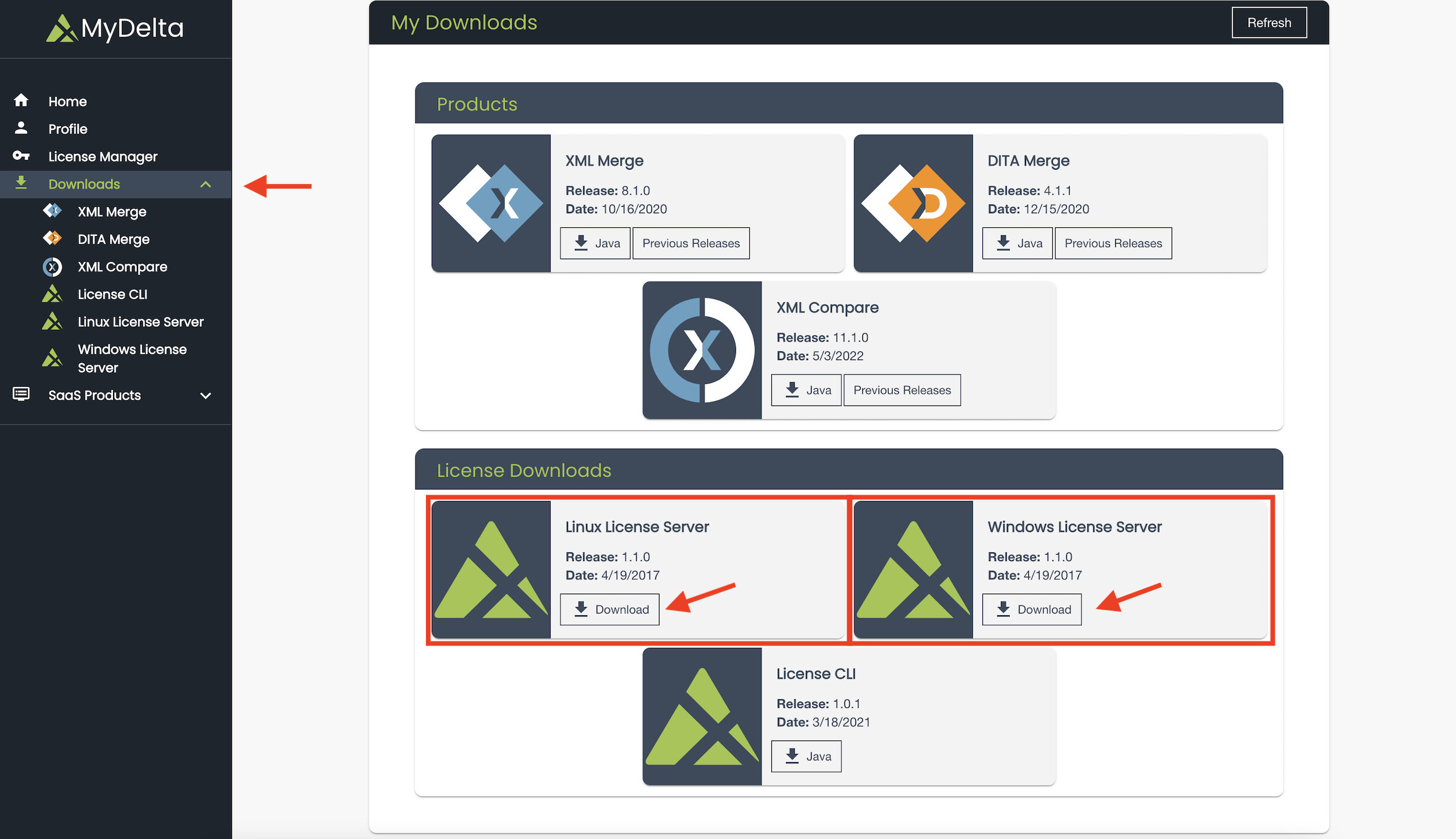To download a license server zip, click on ‘Downloads’ in the navigation panel on the left of the MyDelta page. At the bottom of the page, there will be ‘License Downloads’ section where you should see both Windows and Linux (both 64-bit only) downloads. Then press the Download button to start downloading the server zip of your choice or if you want to see more information about any of the available servers, simply click on the card representing a server download, outside the Download button.