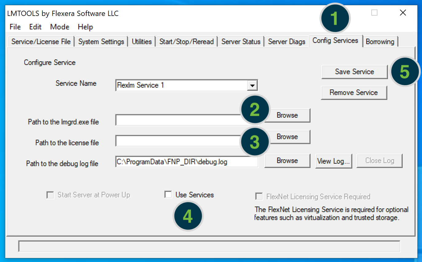Once lmtools.exe is running, the first thing you need to do is configure the service using the Config Services tab, pictured below.