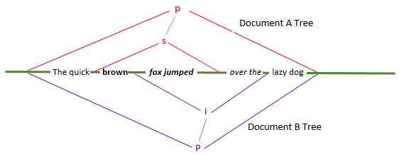 In this section we will take a first detailed look at the DeltaV2 format that is the result of a comparison of two input documents with common text content but overlapping hierarchies.