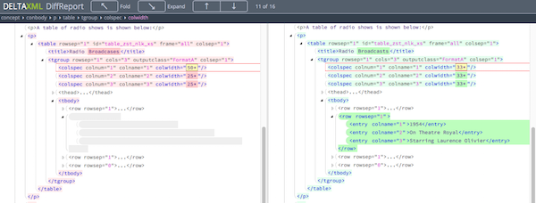 In the Pipelined Comparator, the HTML for this view can be generated using a built in DXP configuration which is invoked from the command-line or GUI using the diffreport-sbs configuration id. Alternatively, it can be generated from the XML Compare API with the dx2-deltaxml-sbs-folding-html.xsl stylesheet added as the final output filter.