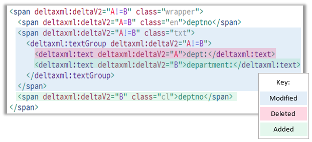 At its simplest, the DeltaV2 format is a representation of the 'A' and 'B' documents in a single document. For this, deltaxml:deltaV2 attributes (in the DeltaXML namespace) are added to all elements where differences are found. The deltaV2 attribute may hold one of the following values: A, B, A=B and A!=B. The A or B represents the document source, and the = or != separator indicates if the matching source elements are the same or different. Extra elements in the DeltaXML namespace are used to represent modified text or attribute nodes. The DeltaV2 format is defined in full in the DeltaV2 reference, a more detailed description of the extensions added in version 2.1 are described in the reference: Overlapping Hierarchies in DeltaV2.