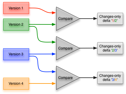 Any version can then easily be recreated by using the recombiner with the stored version and the relevant changes-only delta.
