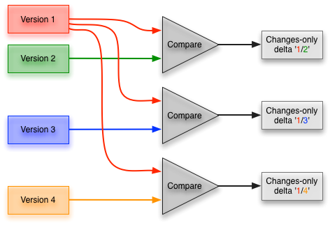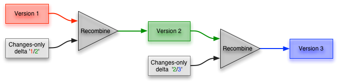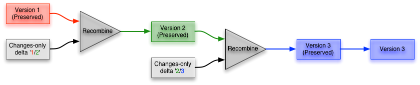 Any version can then be recreated by either forward recombining from version 1, or reverse recombining form the latest version. The issue here is that the more versions you have, the more recombinations it will potentially take to reconstruct a version.