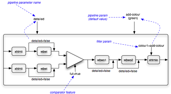 At the centre of a pipeline is a comparator (the triangle), the inputs to the comparator are processed by an ordered sequence of one or more input filters (the rectangles) and the comparator output is also fed through a sequence of filters. Any particular filter may be optional, indicated by the bypass arrow in the diagram. This optionality is controlled by a boolean pipeline parameter, named 'detailed' in the example. When 'detailed' has the value false, four of the filters are bypassed.
