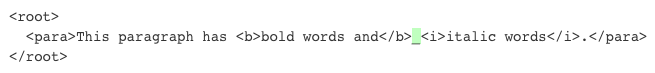 These whitespace nodes are typically used to pretty-print XML files to make them easier to read. The following example highlights inter-element carriage returns (CR) and tabs (T) that are typically used to pretty print the XML. Note that any whitespace can be used, tabs are often replaced by multiple space characters.