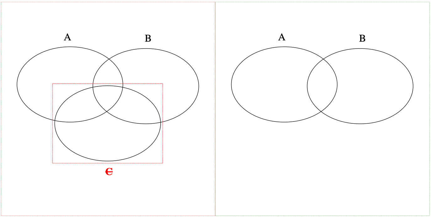 Representation of a Z-index change and a change to the element is shown in the following example. Changes other than Z-index take precedence, which means the element within both the A SVG (source) and the B SVG result (target) is given a respective red/green bounding box.