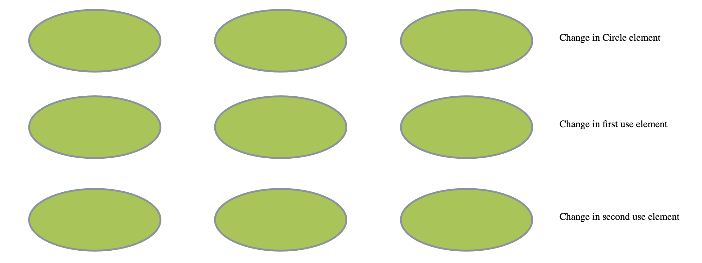 Within SVGs a common element is <use> which references any other SVG element, duplicating it and (when provided with coordinates) moving it to another location. We decided the best way to markup change surrounding chains of referencing elements was to propagate change along the chain, as change to an element will affect all references to it. As shown in the example below, a change to the initial <ellipse> element will be highlight as change in the element itself and any following elements referencing it, with the same logic being applied from any element in the chain i.e a change to the first <use> element.