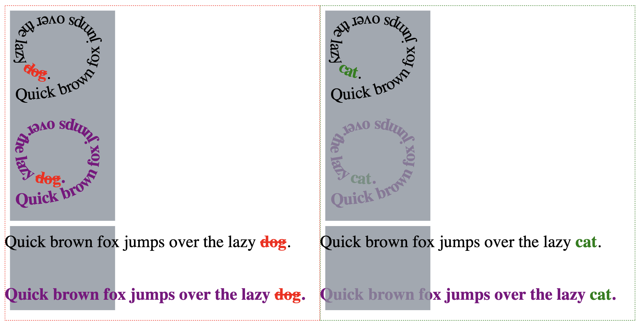 The following example shows representation of change to Text and TextPath elements in SVG. Changes to the text is shown through the highlighting of text within <text> or <textPath> elements using ‘red’ and ‘green’ coloring for A and B respectively, then ‘purple’ for Z-index change. As stated in Example 3, non Z-index change takes precedence over Z-index changes, thus with both a change to the text and a z-index change, the result will highlight additions and deletions of text with ‘red’ and ‘green’ whilst the remaining text will be 'purple' to indicate the Z-index change.