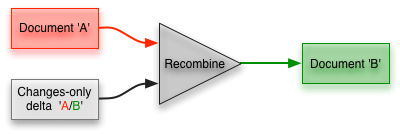 XML Compare comes bundled with a recombiner which can recreate Document ‘B’ with Document ‘A’ and the changes-only delta. The recombiner can also be used in reverse to recreate Document ‘A’ from Document ‘B’ and the changes-only delta. This process is heavily used at DeltaXML as part of our comprehensive roundtrip test suite (to ensure the comparator is 100% accurate).