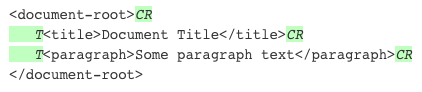 These whitespace nodes are typically used to pretty-print XML files to make them easier to read. The following example highlights inter-element carriage returns (CR) and tabs (T) that are typically used to pretty print the XML. Note that any whitespace can be used, tabs are often replaced by multiple space characters.