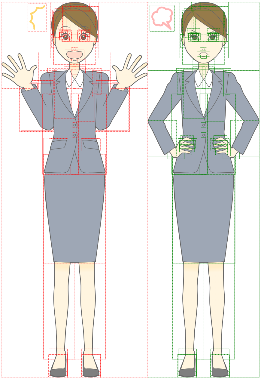 Adjacent SVG comparison is suited for SVG images with significant changes, the result showing the A and B SVG inputs adjacent to one another. A & B inputs are highlighted by default with red and green dashed outlines respectively, however these colours can be user defined. Adjacent results for SVG comparisons do not include highlighted change, ensuring correctly rendered SVGs and a side by side display of the SVG images to view difference.