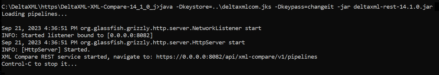 java -Dkeystore=.\deltaxmlcom.jks -Dkeypass=changethis -jar deltaxml-rest-14.1.0.jar