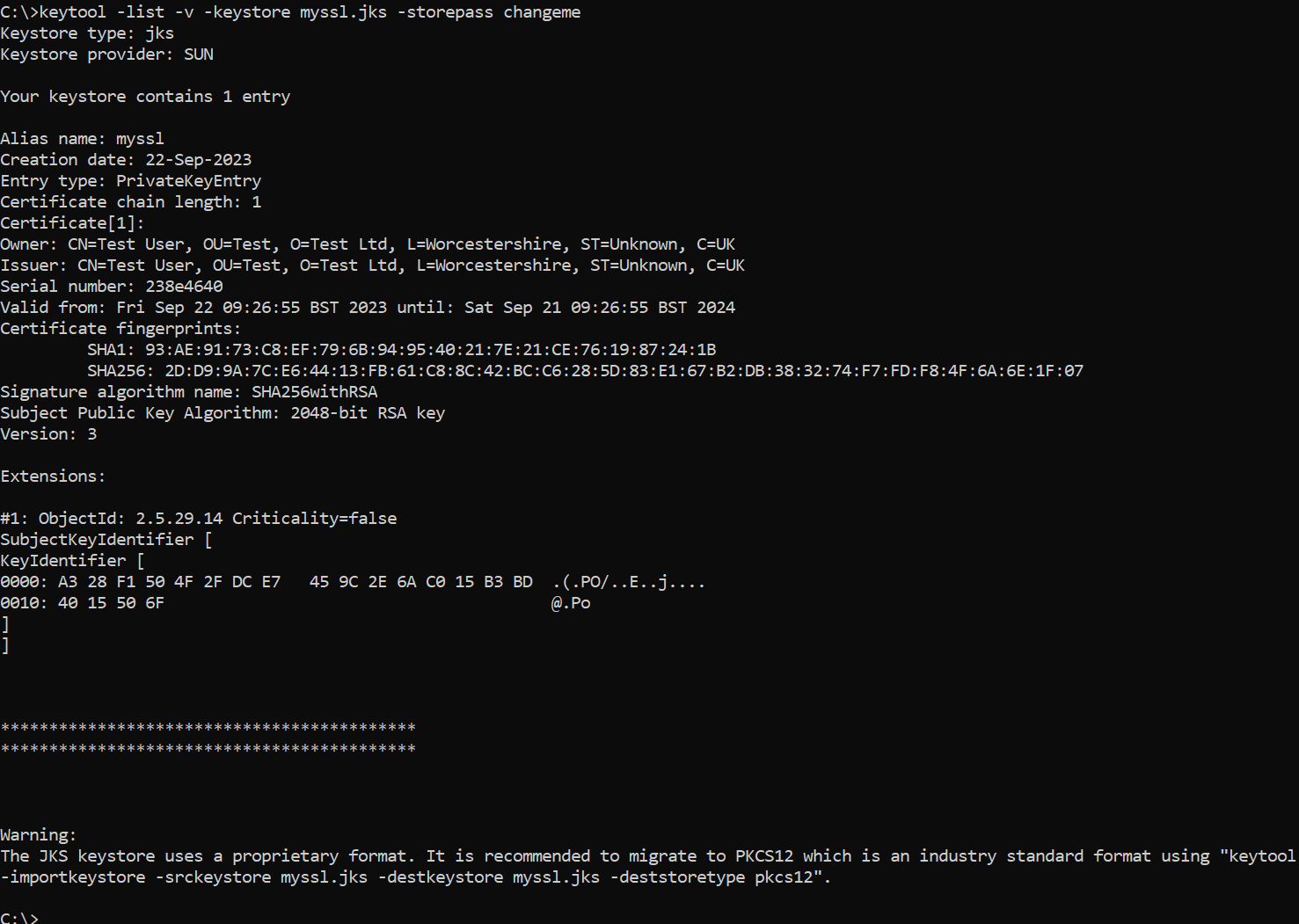 keytool -list -v -keystore myssl.jks -storepass <password>