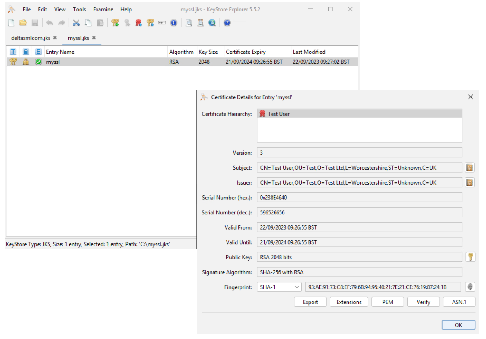 Once you have a keystore (in our case a JKS file) you can simply open that JKS in KeyStore Explorer to see its contents. (Examples in the guide below)