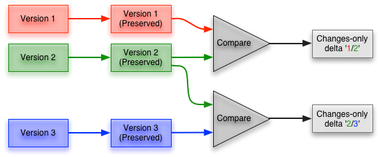 Any version can then easily be recreated by using the recombiner with the stored version and the relevant changes-only delta.