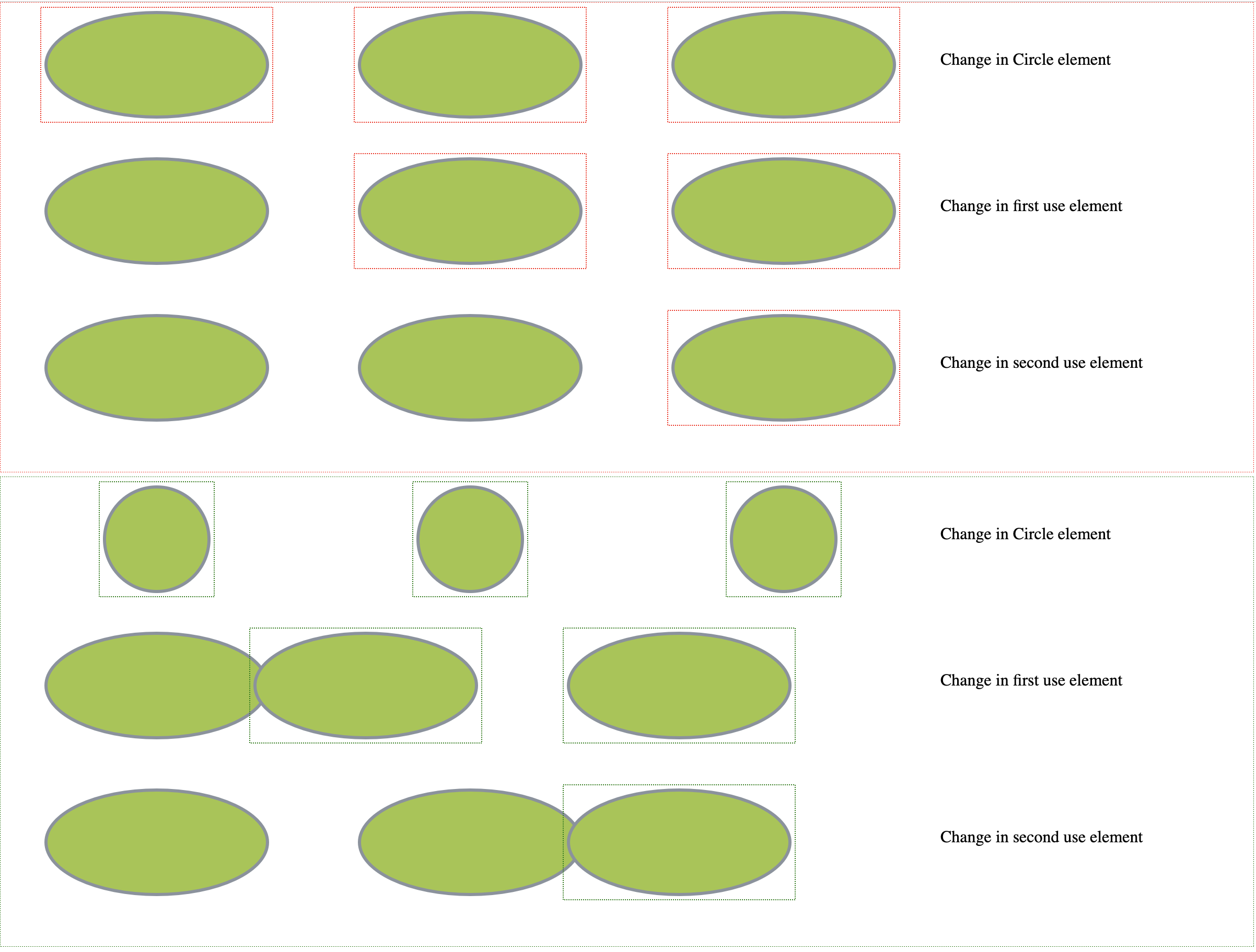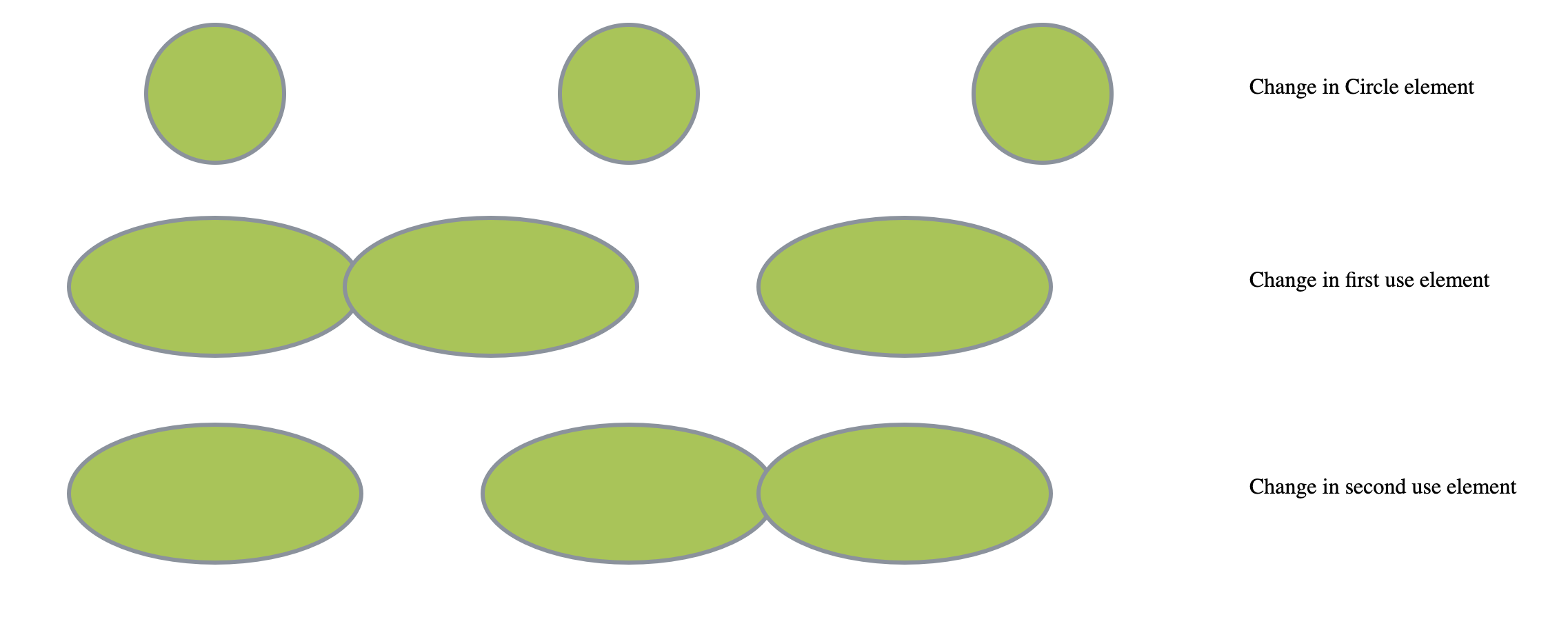 Within SVGs a common element is <use> which references any other SVG element, duplicating it and (when provided with coordinates) moving it to another location. We decided the best way to markup change surrounding chains of referencing elements was to propagate change along the chain, as change to an element will affect all references to it. As shown in the example below, a change to the initial <ellipse> element will be highlight as change in the element itself and any following elements referencing it, with the same logic being applied from any element in the chain i.e a change to the first <use> element.