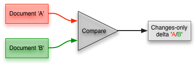 XML Compare comes bundled with a recombiner which can recreate Document ‘B’ with Document ‘A’ and the changes-only delta. The recombiner can also be used in reverse to recreate Document ‘A’ from Document ‘B’ and the changes-only delta. This process is heavily used at DeltaXML as part of our comprehensive roundtrip test suite (to ensure the comparator is 100% accurate).