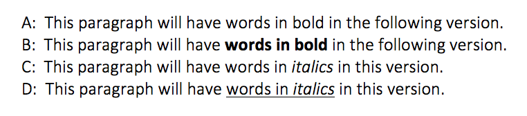 The first modification, shown as version "B" below, has no text changes, but specifies that the text "words in bold" is shown in an emphasised style.