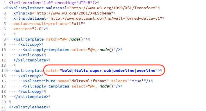As mentioned in the introduction, we need to specify what elements to consider as formatting elements. To do this we provide a stylesheet called mark-formatting.xsl, shown below.
