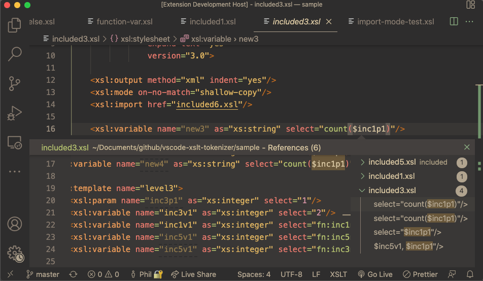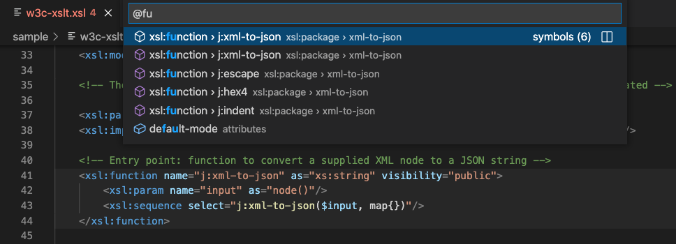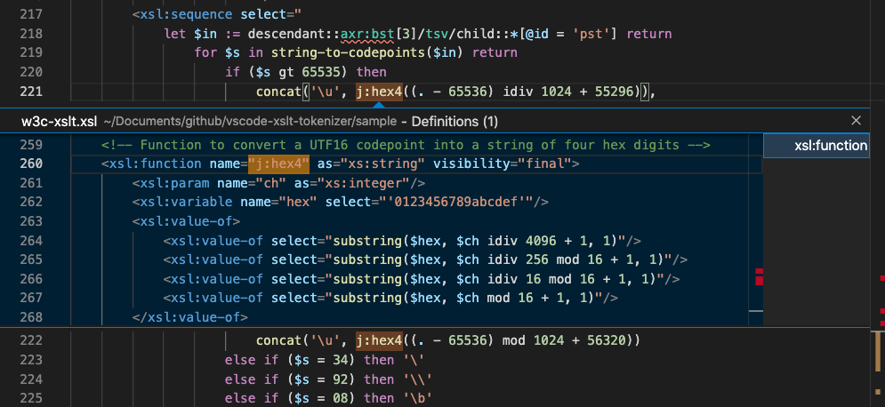 Invoke the Goto Defintion command by pressing (F12) on any symbol name such as a variable or function name. This command navigates you to the location of the symbol definition (for example, the corresponding xsl:variable instruction), opening the containing stylesheet file in the editor group if not already open.