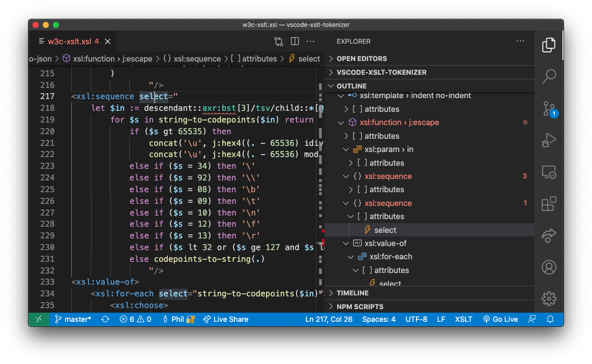 The Outline View (see right-hand panel) is a panel shown at the bottom of the File Explorer. It renders the XML or XSLT document element hierarchy as a tree, symbol names in the tree include element identifiers such as the mode for an xsl:template.