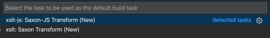 Visual Studio Code's Tasks include custom task types for configuring and running Saxon (Java) or Saxon-JS (JavaScript) XSLT transforms. The Saxon XSLT processor is called via its command-line interface from the Integrated Terminal in Visual Studio code. Task configurations effectively control command-line arguments for the XSLT Processor. An attempt is made to parse any error messages returned from Saxon, so that the position of any Saxon-reported errors in the XSLT can be highlighted.