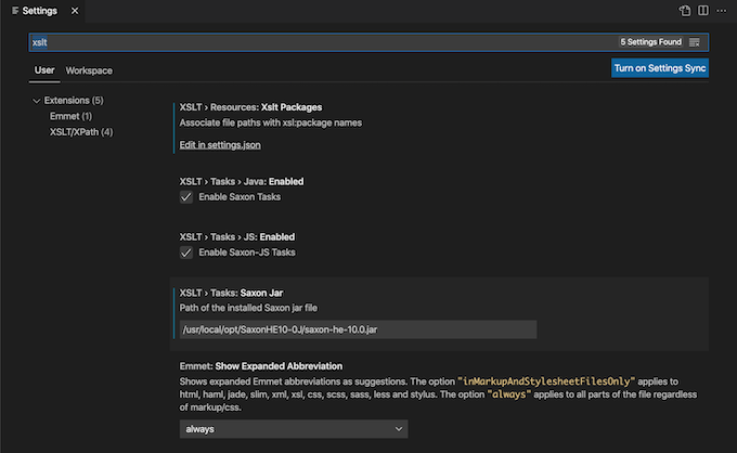 Preferences: Open User Settingsfrom the Command Palette (⇧⌘P) and typexsltto show a short-list of settings:
