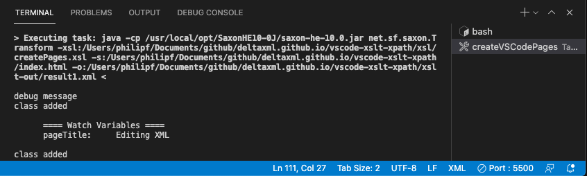 When you start a Task, it is run in a Task tab in Visual Studio Code's Integrated Terminal, the Pane hosting the Terminal view is toggle with (⌘J). The tab label reflects the Task configuration label property. When a Saxon XSLT task is run, xsl:message output and any Saxon errors will be shown in the terminal window.
